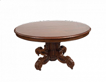 Antique Louis Philippe French table with central foot made entirely of solid walnut. The top is supported by a central stump ending in four cabriolet feet with wooden castors. A special pull-out mechanism enables it to reach a length of 3 metres. The extended part is supported by two compass feet that are lowered for the occasion. P.S: Possibility of having six chairs combined with the table. Provenance: France (1850/60) Condition: Restored by our master craftsmen using traditional handmade shellac and alcohol method. Measurements: 145x127 H72cm. Document: Certificate of Authenticity.