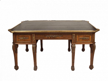 Napoleon III desk in exotic fine woods with gilt bronze piping and leather top. The undershelf band features three drawers adorned with handsome, finely chiseled gilt bronze spouts. Eight donkey's croup feet support the entire structure and are embellished with finely chiseled gilt bronze acanthus leaves. The other face turns out to mirror the main one. Furniture in excellent condition in possession of certificate of authenticity.