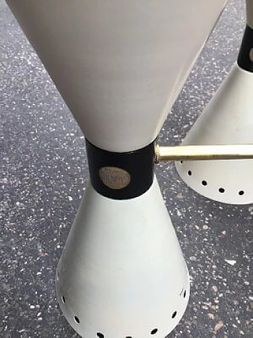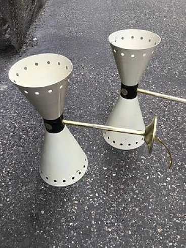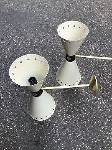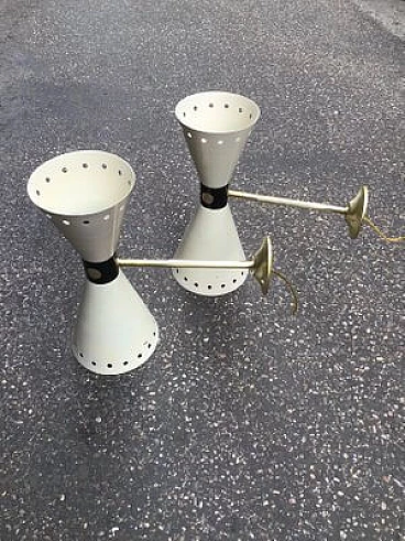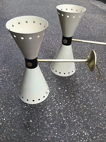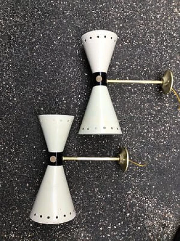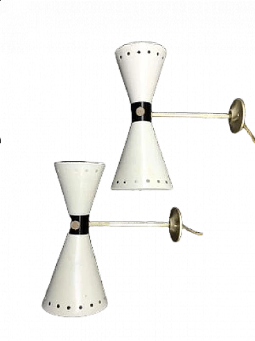 Pair of Diablo wall sconces in fully restored brass with new wiring and lamp holder. The sconces are also suitable for low energy bulbs and mount two E14 bulbs. Specify whether you want them fully restored with re lacquering and polished brass or preserved as found, with burnished brass and lacquering with some scratches.