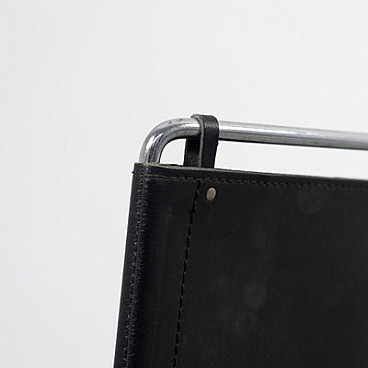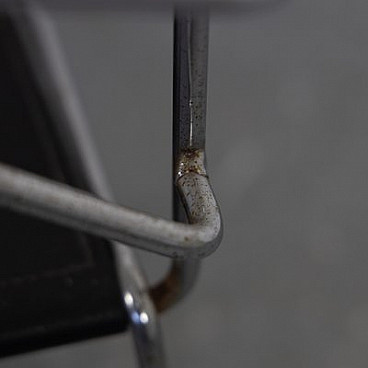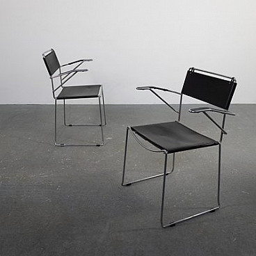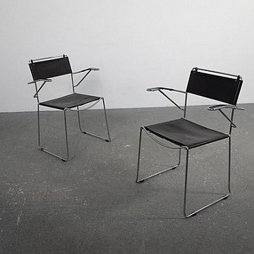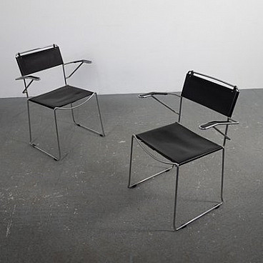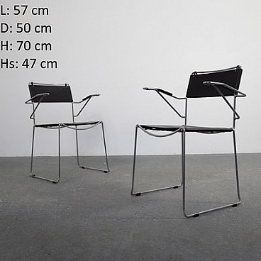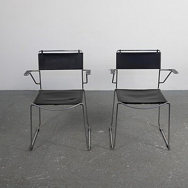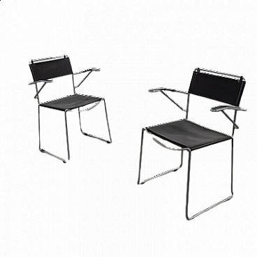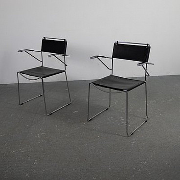 Pair of chairs from the 70s. They have a metal structure and a black leather and imitation leather upholstery. The seats are fully functional, but show signs of age through scratches, dents, faded finishes, minimal upholstery defects or visible repairs.