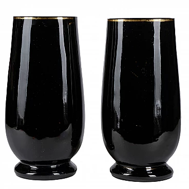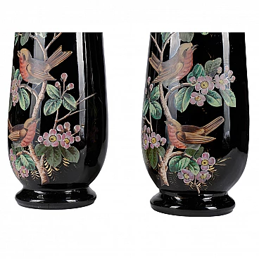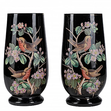 Pair of black opaline glass vases with hand-painted birds, late 19th century