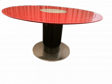 Tavolo tondo base e inserto circolare nel piano, in acciaio, corpo centrale in metallo laccato nero, piano laccato rosso.
