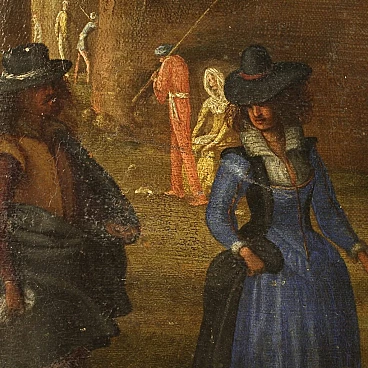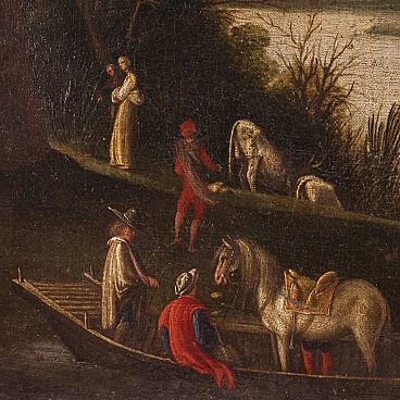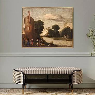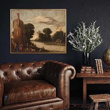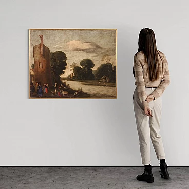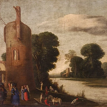 Landscape with figures and tower, oil painting on canvas, first half of the 18th century