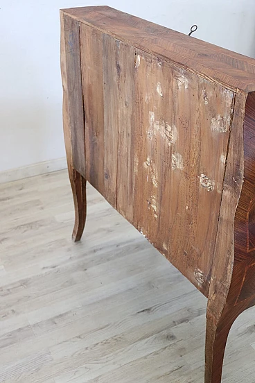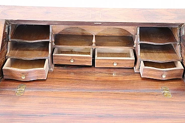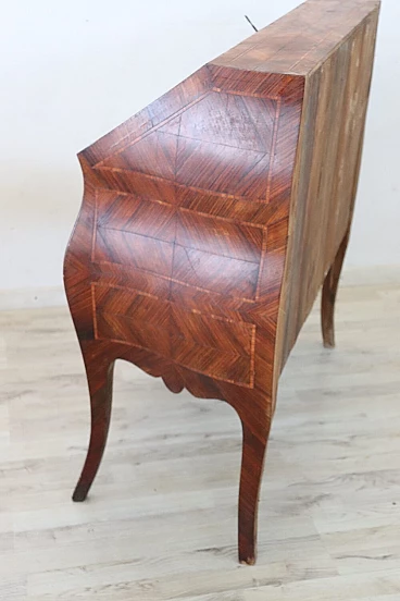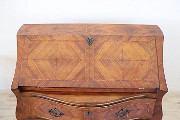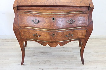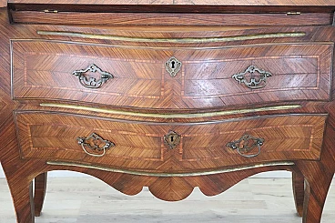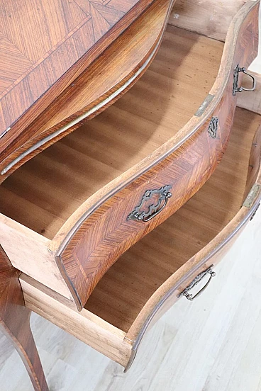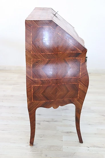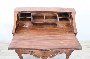 Elegant flap table in antique Louis XV style at the beginning of the 20th century. This piece of furniture is characterised by a fine rosewood veneer. The veneer is laid using the grain of the wood as decoration, the contrasts forming particular decorations in geometric taste on each side of the cabinet. The rounded shape with slender, sinuous encabriolè legs is of great value. The flap-open top becomes a practical writing surface. Inside, four small drawers. Two large, convenient drawers under the flap top. Furniture in excellent condition ready to be placed in your home. We recommend you take a close look at all the attached photos. Offered at a very good negotiable price, we invite you to send us your proposals for purchase and we will evaluate them with pleasure.