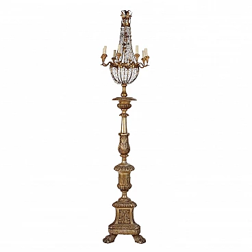 Neoclassical torch in carved and gilded wood, lion feet and decorations with pods and leaf carvings. Later transformed at the beginning of the 20th century into an 8 light floor lamp with a hot air balloon structure in gilded metal and sheet metal. Light holder in gilded wood with glass necklaces.