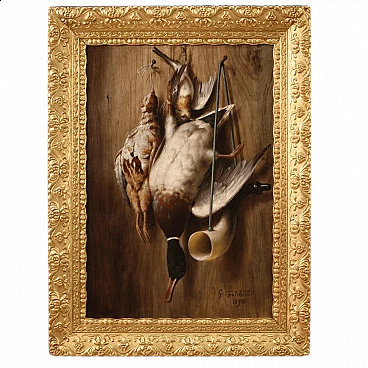 Italian painting dated 1890. First oil on canvas work depicting still life, hunting trophies by an outstanding painterly hand. Painting adorned with finely chiselled and gilded Art Nouveau wood and plaster frame. Painting signed and dated lower right G. Falchetti 1890 (see photo) referable to the painter Giuseppe Falchetti (1843-1918), lacking authentication. Fabulous wooden panel used as a background by the painter to create a three-dimensional effect in the still life. Animals and horn finely painted in the finest detail, a subject for antique dealers, interior decorators and hunting trophy collectors. Work is part of a pendant (see photo and ask for block price if available). In good condition. Light painting H 66 x W 45 cm.