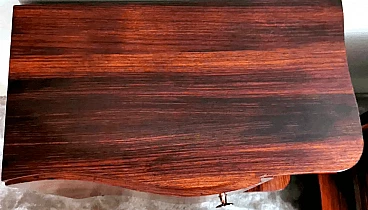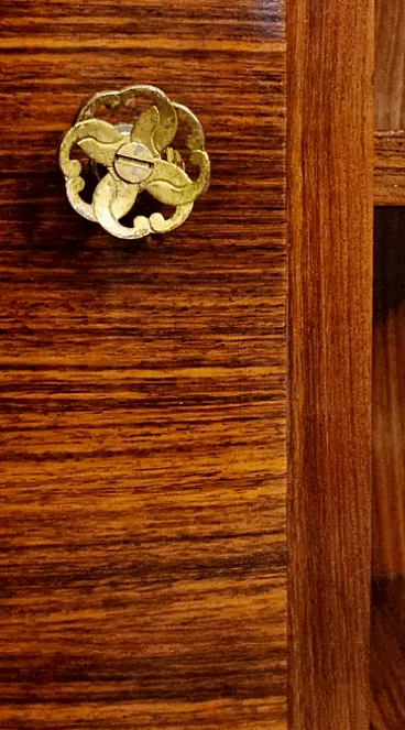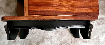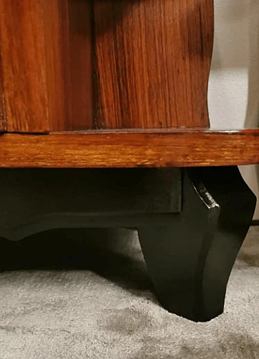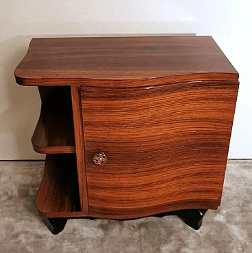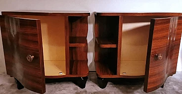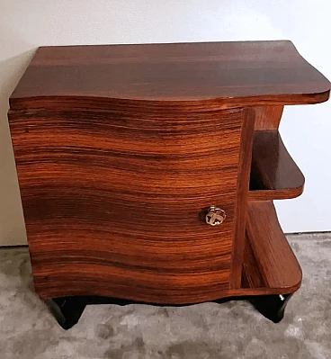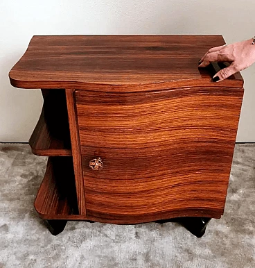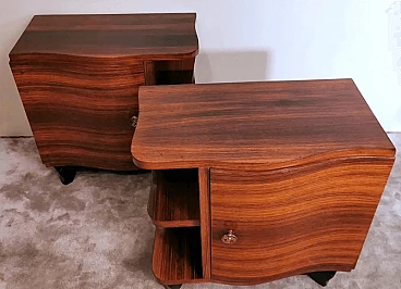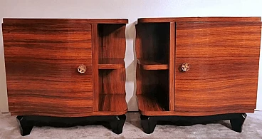 Pair of wooden bedside tables; the whole front instead of being straight and linear is "wavy", and to give greater prominence to this aspect, the craftsmen have arranged the wood of the doors with horizontal veins, enhancing the wavy aesthetic in an intelligent and significant way; for each bedside table, the upper shelf has two straight and two wavy sides, and the functional space below is divided by a large compartment closed by a door and by an external space with a small and practical exposed shelf; the bedside table has four solid shaped feet in black lacquered wood, the two front ones are joined by an ornamental crosspiece also in black lacquered wood; the doors close by pressure and are equipped with two brass handles in the shape of a woven flower; one of these had lost the central part, replaced over time by a screw. Sapele was used for the construction of these two pieces of furniture, a prestigious reddish-colored wood similar to mahogany from equatorial Africa. This sophisticated material has a dense weave and intertwined fibers, fine and uniform and with a good natural sheen. It is a sturdy type of wood, rather flexible, hard and compact. It is usually used for luxury furniture and wardrobes, but also for the furnishing of yachts and boats and for sophisticated and expensive musical instruments. The entire structure was made of raw Sapele, which was then veneered with the same wood, but using the most precious part of Sapele, the one that has multiple natural veins that are always different; the part subjected to polishing was able to enhance the chromatism and the flaming of this exceptional exotic wood. The bedside tables have been hand-treated with ancient restoration techniques by a team of craftsmen and are in excellent condition.