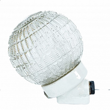 The brusel style 6/250 wall lamp was produced in Czechoslovakia in the 1960s by Elektrosvit Nové Zámky. It is made of transparent, pressed glass with a geometric structure set on a ceramic base. Very good condition, with slight signs of use. The lamp is fully operational for a single E27 bulb - for a large thread up to 60W. Dimensions: height 23 cm | diameter 14 cm Dimensions in inches: height 9 in | diameter 5.5 in