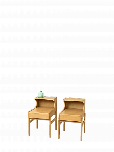 Pair of Swedish bedside tables of Scandinavian manufacture. These bedside tables clearly respond to mid-century lines from Northern Europe, made with oak veneer with evident wood grain that manage to create illusions of movement on all surfaces. With a narrow and elongated shape, these design objects have a deep wooden drawer. They have been cleaned and restored to their original splendor thanks to two coats of waxed shellac and pure beeswax with carnauba. Good conditions. A conservative restoration was done. It may show signs of aging. For please pay attention to the photographs.