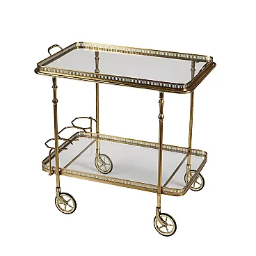 Serving cart with double shelf and bottle holder, made of glass and brass.