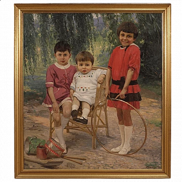 Italian painting dated 1919. Oil on canvas work depicting Portrait of Children with Games with an excellent painterly hand. A painting of great size and impact adorned with a beautifully decorated sculpted and gilded Arquati frame. Painting of fabulous luminosity and pleasant decoration signed and dated lower right Parachini 919 (see photo) referable to the painter Achille Parachini (1888-1970) lacking authentication. Work of pleasing perspective and depth finely painted in the smallest details of clothes and toys (see photo). It has undergone conservative restoration with two small patches visible on the back (see photo). In good condition. Painted light H 126.5 x W 112 cm.