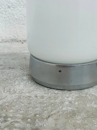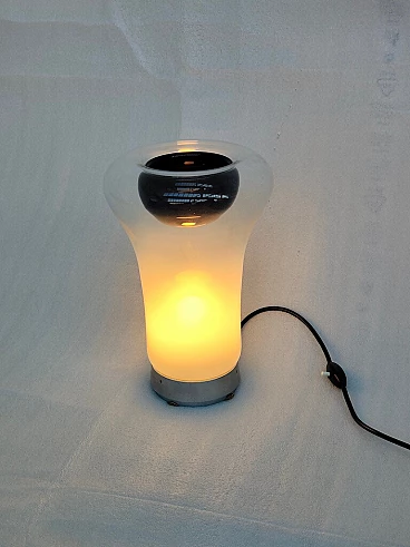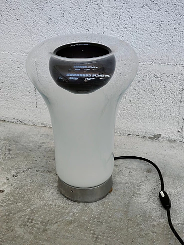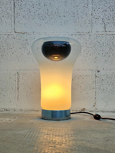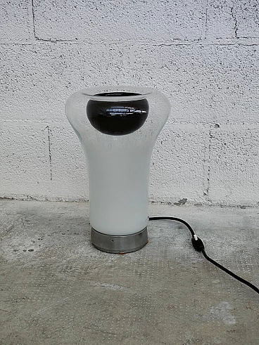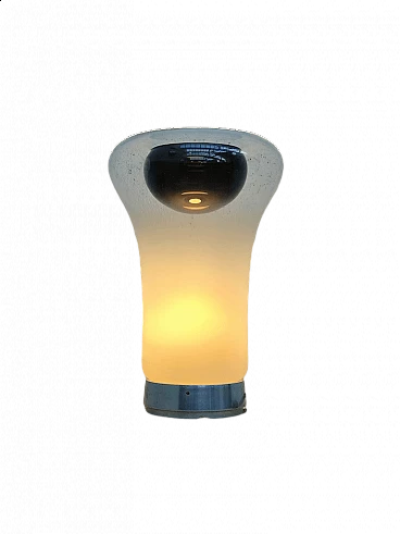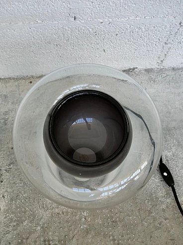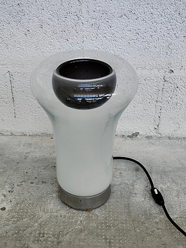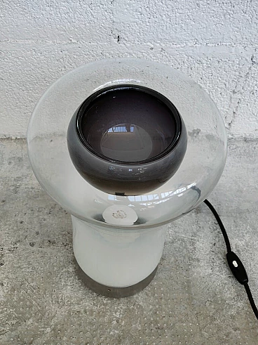 The Saffo table lamp was designed by Angelo Mangiarotti for Artemide in 1967. The aluminum base supports the mushroom-shaped lampshade in smoked Murano blown glass. The glass is mouth blown in two colors and in one piece. The Saffo lamp creates a fantastic ethereal light effect. This lamp has been out of production for many years and has never been re-edited.