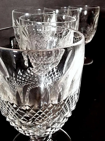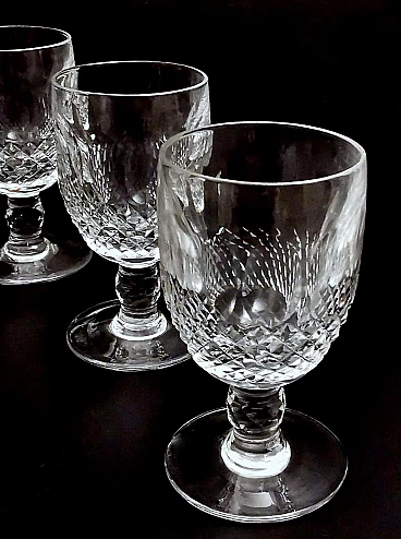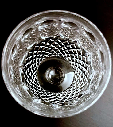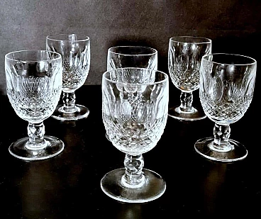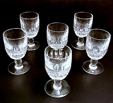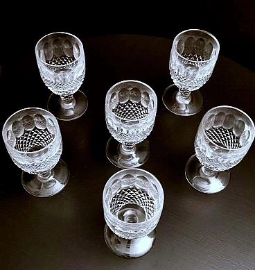Set of 6 French ground crystal liqueur glasses; crystal with a lead content of 30% was used in their execution; the high lead content, replacing calcium, found in ordinary glass, gives the crystal considerable hardness, exceptional transparency and a high refractive index; with the techniques of cutting, grinding and polishing, scrupulously performed by hand, extraordinary plays of light and reflections have been created; the shape of the glasses is classic but very refined and elegant, they have simple and delicate grinding, they have also been ground with precise and dense faceting to enhance the diamond refraction of light; were made in the Beaux-Art style between 1920 and 1925 in an artisanal workshop in the Nancy district (France), famous for its high concentration of factories and artisans specializing in crystal work (Daum, Baccarat, Saint Louis, etc.); certainly the artist who created the glasses was also performing work for Saint Louis, in fact in the grinding designs he was inspired by the famous crystalware and finished the objects with the same high quality as Saint Louis. The Parisian style, Beaux-Arts originated from the legendary École des Beaux-Arts (School of Fine Arts) in Paris; flourishing during the 19th and early 20th centuries, it was a grandiose elaboration of the finest French neoclassicism, also incorporated Renaissance and Baroque elements, but used modern materials, both in architecture and objects, such as iron, glass, and crystal; was important in France until the early 1900s, this style is taken up in neighboring European countries but also, with great success, in the United States. Our glasses are exquisitely crafted artifacts that exude culture, art, class, and quality and can give your environment an unmistakable mark of style combined with a special charm, with aristocratic and elite tones. The glasses are in good condition.
