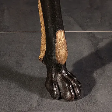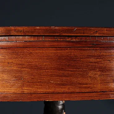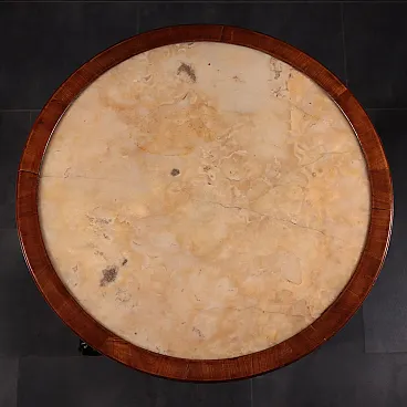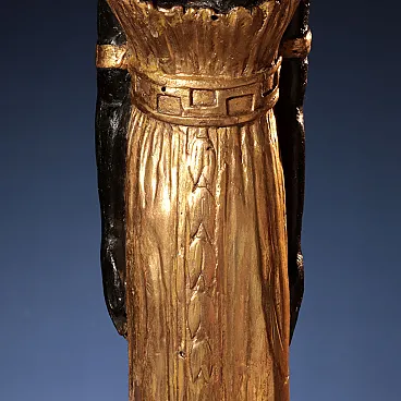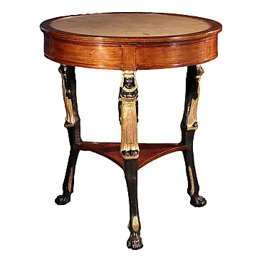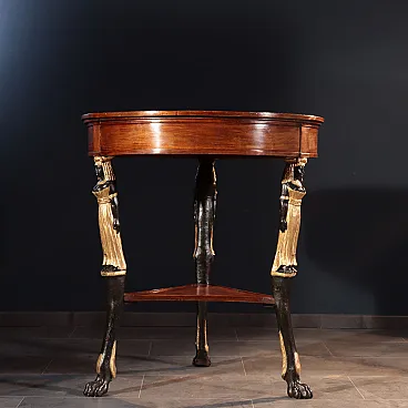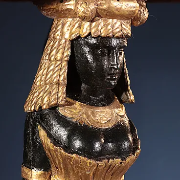 Gueridon dating back to the period of the Kingdom of the Two Sicilies, supported by three carved uprights with leonine feet; the upper part has caryatids. The female figures are standing, dressed according to Egyptian taste: they wear a low-cut dress that leaves their breasts uncovered and cinched at the waist by a belt; they wear bracelets and necklaces while their hair is styled according to Egyptian taste, with braids falling neatly over their shoulders. The skin of these figures is ebonized, clothing and details are gilded.
