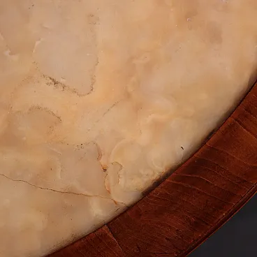 Alabaster circular top, enclosed within a cherry veneered frame.