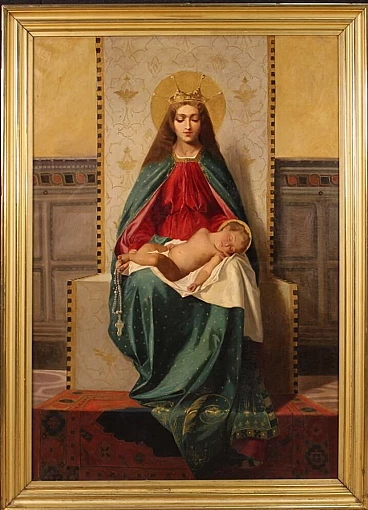 Fabulous Italian painting dated 1875. First oil on canvas work depicting religious subject Madonna enthroned with sleeping child by an excellent painterly hand. Painting of great size and impact characterised by vivid and bright colours. Wood and plaster frame, carved and gilded, structurally sound, with some small signs of time (see photo). Painted vertically, signed and dated lower left (see photo) Emma Regis 1875 referring to the Turin-born painter (1854-?), lacking authentication. The colourful and embroidered robes of the Madonna, the ornate carpet at the feet of the Virgin and the gilded decorations on the throne are fabulous. A work of particular perspective for antique dealers, interior decorators and collectors of 19th century Italian paintings. It shows some signs of time, in beautiful patina, overall in good state of preservation. Light painting H 139 x W 95 cm.