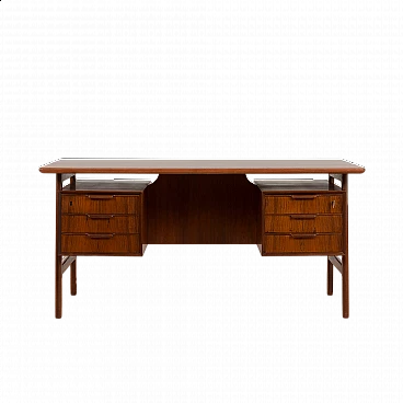 Executive desk designed by Omann Jun in the 1950s. It features six drawers with elegant carved wooden drawers. Additional storage space is located on the back. Solid rosewood legs support a floating table top that allows for additional storage space under the desk door. Constructed of solid rosewood with rosewood veneers. The desk has been refreshed with professional oils, but there are still small signs of wear (small dark spots) visible on the tabletop. Apart from that, the original condition is very good. Original key included.