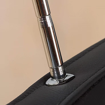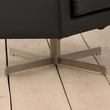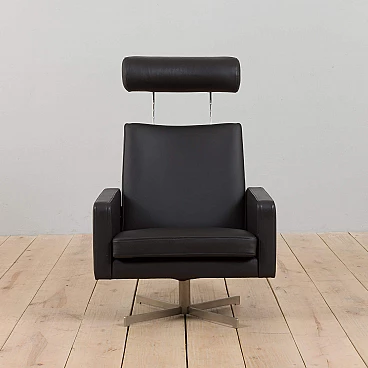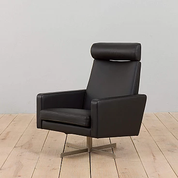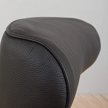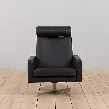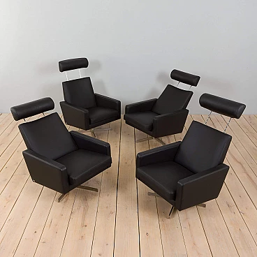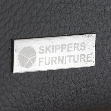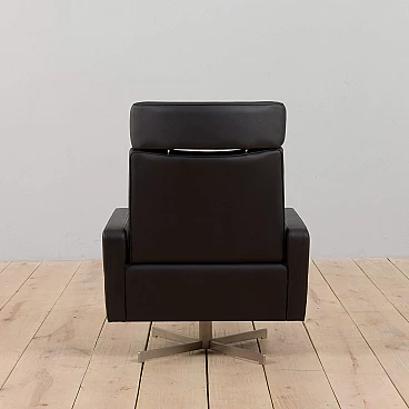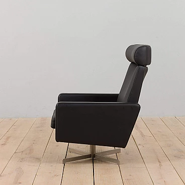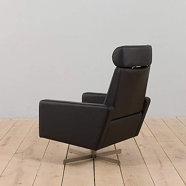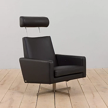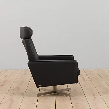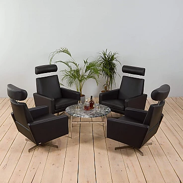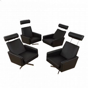 4 black leather lounge armchairs designed and produced in the 80s by Skipper Furniture, a well-known company founded by Svend Skipper in the 50s. Manufacturer's label preserved. These high quality black leather recliner chairs are comfortable and stylish. They are equipped with removable headrests and a reclining backrest, which increases the comfort of rest for those who use them. They stand on a swivel base in chromed steel. Excellent original condition with light patina on the steel and slight discolorations and stains on the leather.