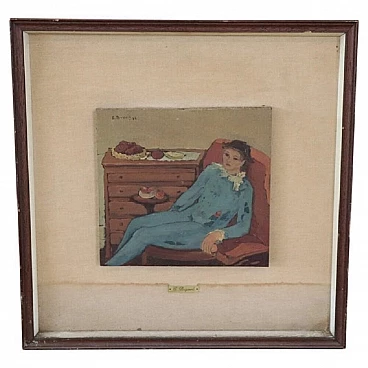 Oil painting on panel dated 1976 and signed by Elda Brignoli, an important Italian artist. The painting is small in size but of very high artistic quality. Interior scene with a woman resting in an armchair. Skillful use of colors. Born in Milan in 1938, Elda Brignoli began painting under the guidance of well-known Milanese figurative painters. She is an ever-evolving painter, initially focusing on landscape but later the figure becomes predominant in her works. Her solo exhibitions and participation in important prizes are numerous, with multiple awards.