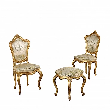 Pair of Rococò-style chairs and stool, rocaille-carved and gilded wood, late 19th-century Italy. Stiffened legs, upholstered backs and seats.