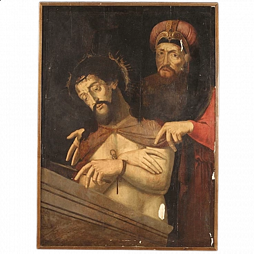 Old Flemish painting from the 17th century. Oil on panel work, pasted on multilayer panel, depicting religious subject Ecce Homo of good painterly hand. Painting of great size and impact ideal for inclusion in an important salon or study. Painting complete with modern wooden frame applied to the side of the work (see photo). Painting with a dark background that creates a strong contrast with the bright colors of the robes and the carnal of Christ (see photo). Painting of great pictorial intensity and pathos, for antiquarians, interior decorators and collectors of ancient sacred art. Fabulous the suffering face of Christ, bound and crowned with thorns, painted at the moment when Pontius Pilate, behind him, shows him to the crowd. Board showing some color falls and signs of restoration work and color recovery (see photo). In fair condition with signs of time. In need of restoration. Light painting H 110.5 x W 79.5 cm.