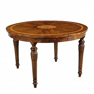 Neoclassical walnut extensible round table, made in Lombardy in the last quarter of the 18th century. Segmented walnut pedule top with central fan inlay and boxwood band on edge with burin engravings depicting landscapes and dolphins facing each other. Four solid walnut legs tapered and rudentate with leaf motif carvings. The top extension is not coeval.