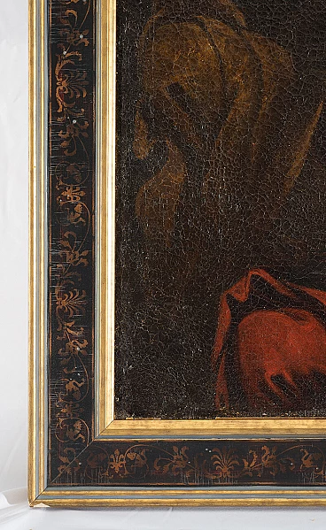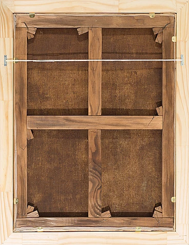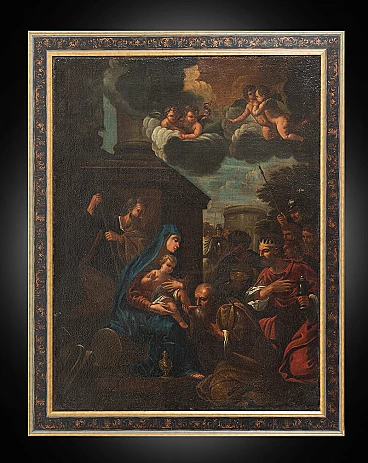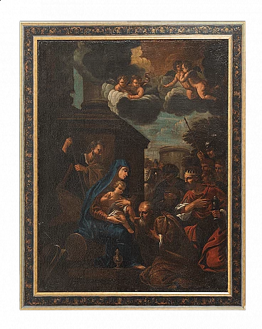 Oil on canvas depicting the Adoration of the Magi, made in Naples in the 18th century. The theme is developed according to traditional iconography: the Magi are facing the Holy Family, on the left of the composition. The eldest, kneeling in adoration of the Child while kissing his foot, has already laid the gift at the feet of the Virgin, while the second and third ones await their moment to honor the sacred event with the gifts still in their hands. Providing a perspective background are two clouds with putti observing the scene.