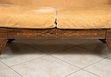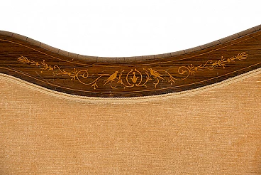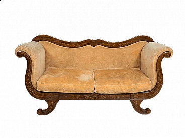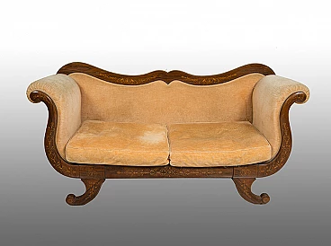 French Charles X sofa, made in the 19th century of fine exotic wood with maple inlay grafts in a leaf motif. The backrest has an arched outline with wood placed crosswise and is characterized by curves and counter-curves; it is interrupted in the central section by an inlay with birds. The upholstered armrests are also contoured with an inlaid wood frame. The feet have the classic curvilinear pattern typical of this style.