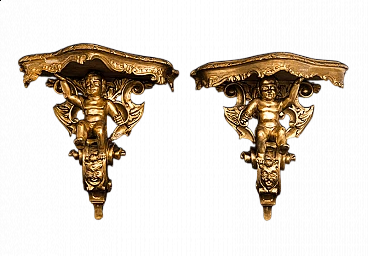 Pair of Genoese corbels in gilt and carved wood dating from the second half of the 19th century. The mixtilinear shelf is supported by a central pilaster where a putto in a joyful attitude is overlaid. Below the putti is a curved shelf where an allegorical mask rests. Very good condition, Genoa 1870-80. Certificate of authenticity. We are at your disposal for further clarification or photographic details.