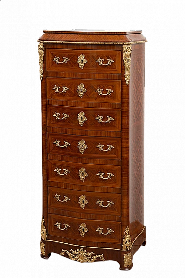 Napoleon III "settimino" drawers in exotic wood. The front has seven drawers adorned with finely chiseled gilt bronze spouts. The drawers have precious handles, also in bronze, while the cantons are enriched by the presence of imposing friezes. French manufacture, 19th century.