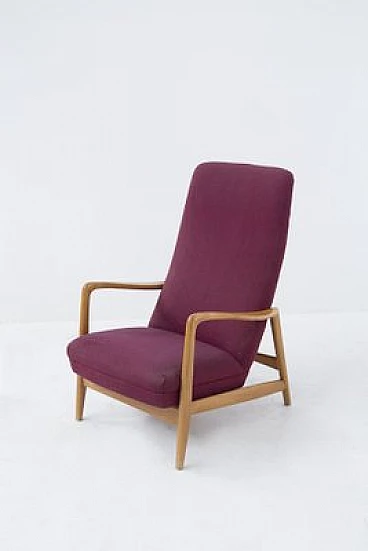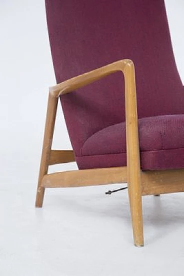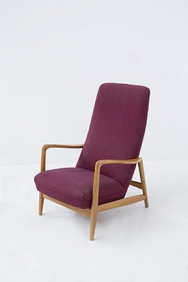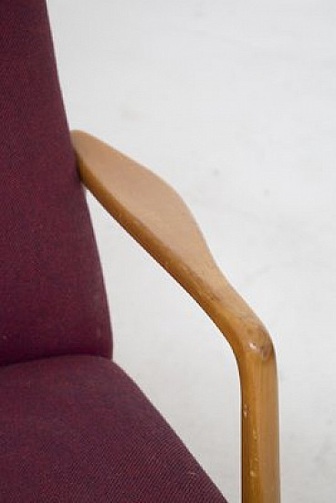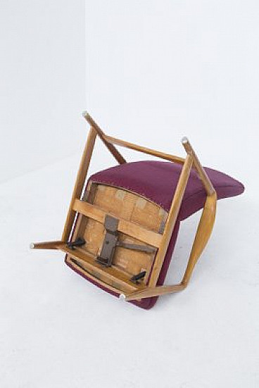 The seat and back are joined by upholstery which is original to the period. Its fabric is a fine and original purple-red fabric. The slightly curved armrests convey comfort and stability. The feet are also made entirely of light wood. Original condition. Suitable for elegant bedrooms with vintage design.