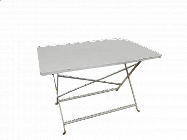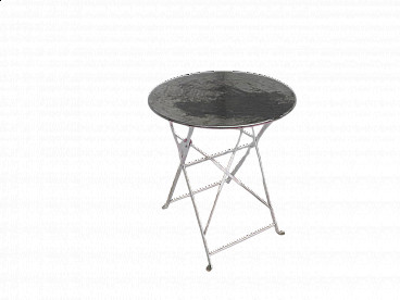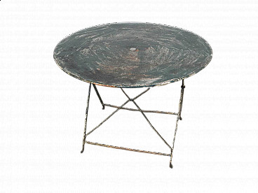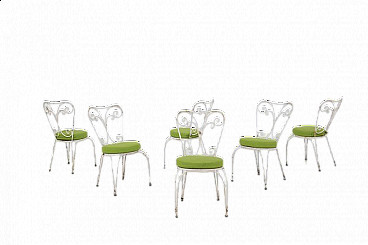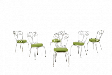 Splendid set composed of 6 iron chairs designed by Lio Carminati for the Casa e Giardino edition, belonging to the 1950s. It assumes a collaboration with Gio ponti. There are six chairs and they are all the same. The frame is made of white iron, beautiful and durable. There are 4 legs and they are slightly convex under the seat and then descend diagonally, making the seat stable. The seat is made with a bright green cotton cushion; the fabric looks new because it was found still wrapped in its plastic. The backrest, on the other hand, is the clue piece: in fact to a trapezoidal shape, with very rounded corners. The backrest is practically hollowed out, with only subtle cast-iron curls evident, giving the seat a romantic aura. The chairs are ideal as garden chairs or for sweet patios.