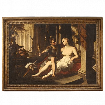 Splendid Italian painting from the second half of the 17th century. Oil on canvas work of remarkable size and pictorial quality, depicting the love story between Rinaldo and Armida told in Gerusalemme liberata, the most important epic poem by Torquato Tasso. Armida has bewitched Rinaldo because of her beauty and especially because of a magic mirror, but she too has fallen in love with the hero. The soldier then abandons his duties as a crusader; in fact, the helmet and sword are at his feet. However, comrades-in-arms in the background arrive, who soon reveal to him that he is under a spell and bring him back to the Christian ranks. Wonderful landscape and classical-style architecture surrounding the characters. Painting restored with rintelo and color recovery in a few small spots, overall in excellent state of preservation. Beautifully decorated 20th-century carved and gilded wooden frame (bronze tint). Light painting H 114 x W 164 cm.