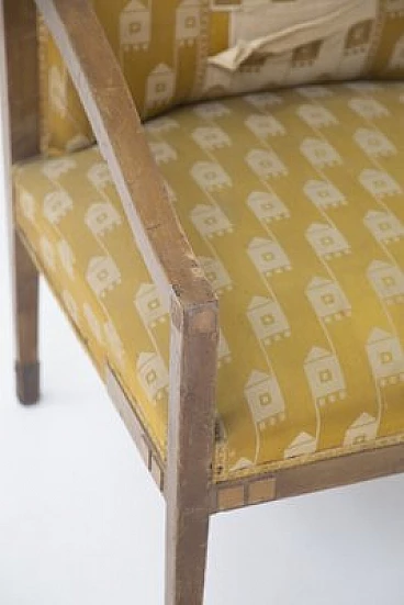 The seat is upholstered and covered with a golden yellow fabric, decorated with cream-colored geometric shapes.
