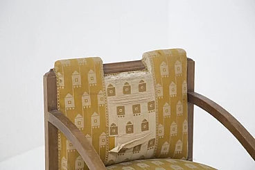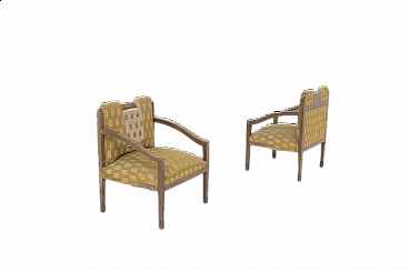 The armchairs are juxtaposed with a sofa in the same style. The armchairs are in good and original vintage condition with its original fabric. Wear and scratches are consistent with use and time. Some warping is present. As this is a vintage item, minor defects may be present.