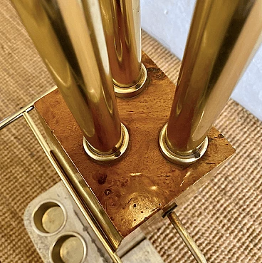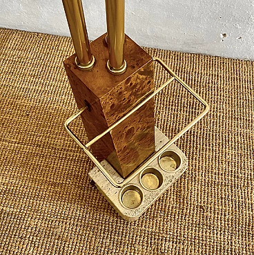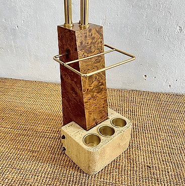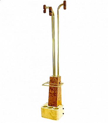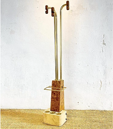 Coat hanger and umbrella stand made of travertine, tuia burl, and brass in the style of Willy Rizzo, 1970s.