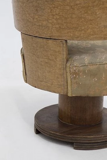 This small armchair has a base of fine wood, with a round, beautifully striped footstool supporting the main round trunk that supports the seat.