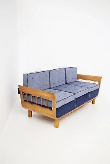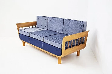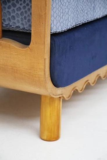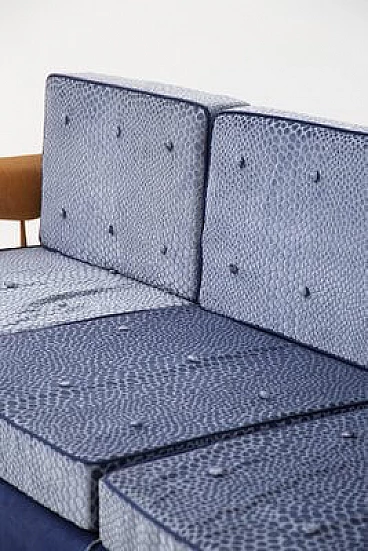 Fabulous wood and fabric sofa attributed to the great designer Paolo Buffa, of fine Italian manufacture, produced in the 1950s.