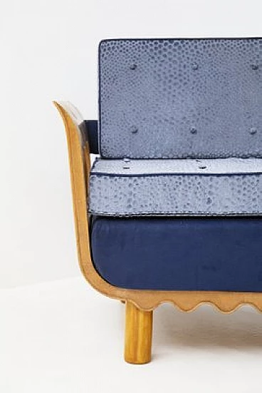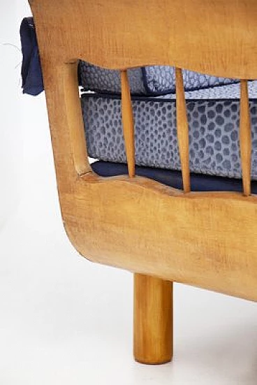 At the side, the sofa is bevelled and rises in the same way up to the armrests. The armrests also have a soft shape, centrally they are worked: the wood has been hollowed out and worked with a wave weave and small decorative wooden tubular elements, which give elegance and extravagance together.