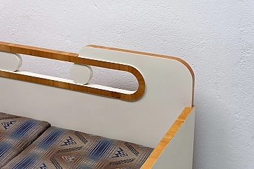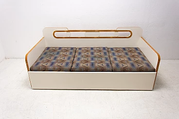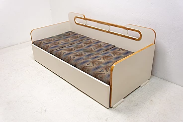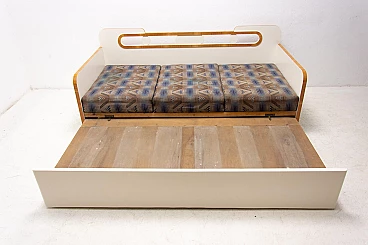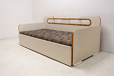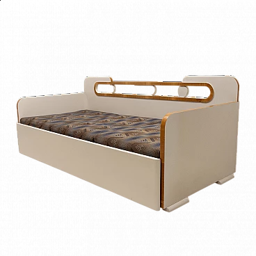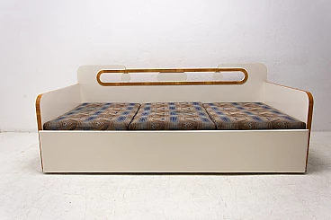 This folding Art Deco sofa was made in the 1930s in the former Czechoslovakia. The piece is an example of the Czechoslovak Pre-war Art Deco style in combination with Cubist elements and it ´s characterized by white painted wooden structure and storage space. It can be unfolded like a bed. Sofa is in excellent condition, fully restored.The mattresses are not restored but it´s in very good condition. Measures: Lenght: 191 cm Height: 76 cm Depth: 92 cm Seat height: 38 cm Sleeping area: 170×184 cm