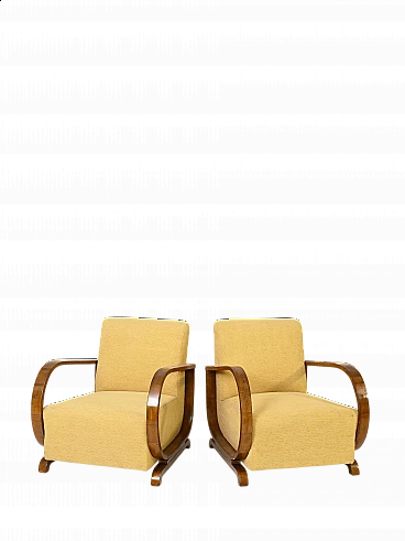 Pair of Art Deco armchairs in beechwood and yellow fabric, 1940s