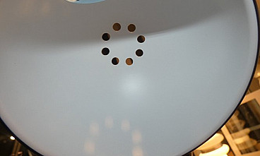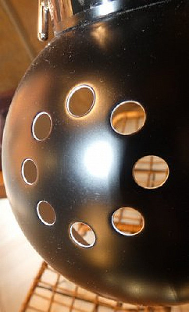Wall lamp 265 created by Paolo Rizzatto in 1973 for Arteluce, a patent later acquired by Flos, it is an ingenious wall lamp with an arm, tilting and swiveling, made of black painted steel. 265 is a wall lamp that doubles as a ceiling or pendant lamp, it is the ideal solution in all those situations where you want to illuminate a surface such as a dining table or sofa positioned near a wall but where a ceiling electrical connection is not available. In fact, this lamp is installed on the wall but connects to a normal electrical outlet via the cord equipped with a plug, so it can be installed in any wall in which there is an electrical outlet. The arm can swivel freely left and right and oscillate in the vertical plane, allowing the reflector to be raised and lowered. There is an adjustable counterweight to balance the structure and ensure that the diffuser maintains its position. The lamp, a stock item, is like new and with original packaging. Measurements in photo.