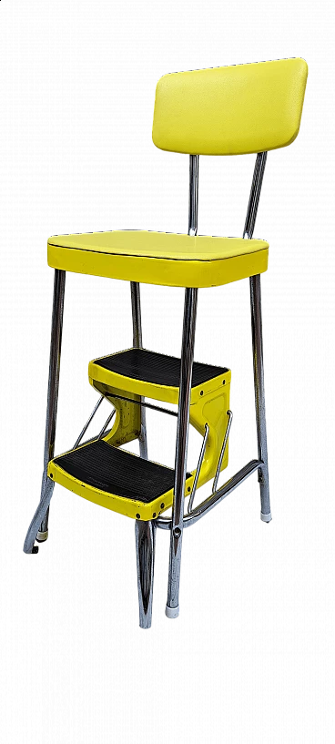 Yellow stool with ladder by Prestige, 1960s. Faux leather seat and back, chromed structure and retractable steps.