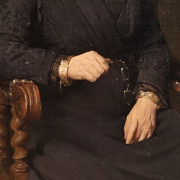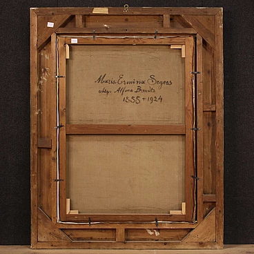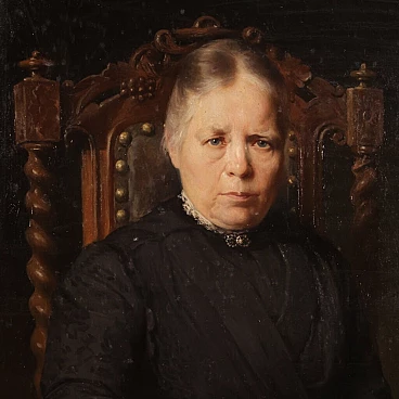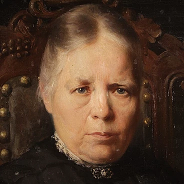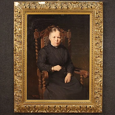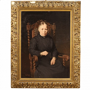 Oil on canvas depicting a female portrait. The work is dated and signed: it dates back to 1920, is attributable to the Belgian painter Leo Steel (1878-1938), and depicts Maria Erminia Segers (1855-1924). Missing authentication. The canvas has some stains and signs of time, it needs restoration work. Wood and plaster frame, carved and gilded, with several missing decorations and signs of restoration; it needs further restoration work. The painting without the frame measures 113 cm x 83 cm.