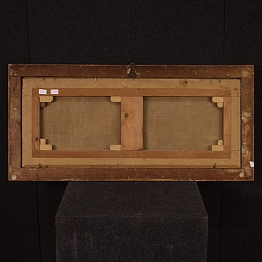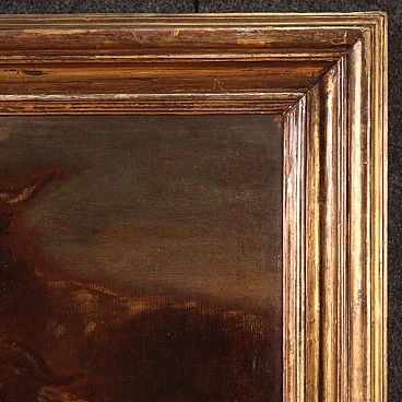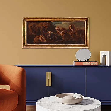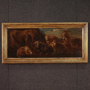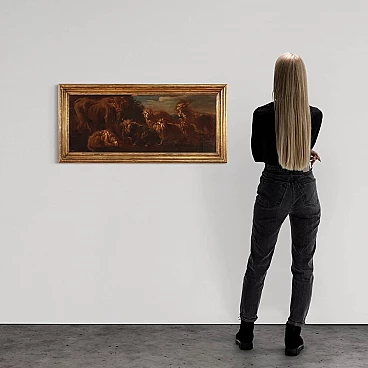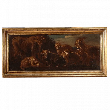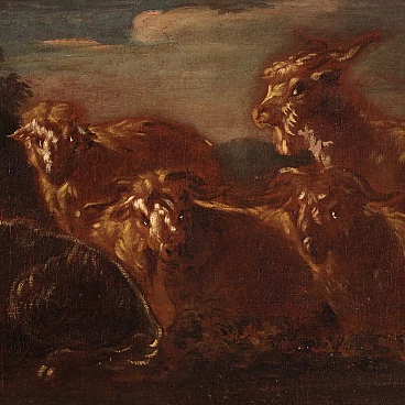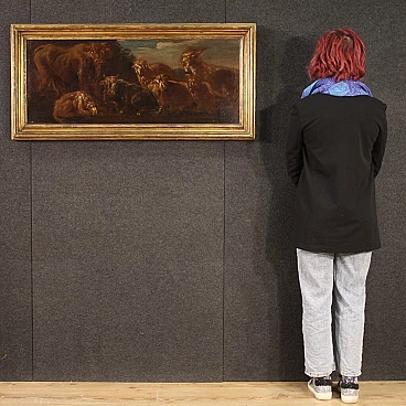 Antique Italian painting from the second half of the 17th century. Oil-on-canvas work depicting grazing animals, of good pictorial quality, in the style of Rosa da Tivoli. Painting unfolding horizontally, of interesting size and proportion, adorned with antique wooden frame, not coeval, carved and gilded. Work easily placeable in various places in the home, for antique dealers, interior decorators and collectors of genre paintings. Painting characterized by a dark hue depicting numerous goats and a bovine in the upper left corner (see photo). It has undergone conservation restoration, frame replacement, color repainting in places and has been restretched (see photos). Part of a pendant (see photos and ask for price of the pair if available). In good condition. Size without frame: 37.5 cm x 97.5 cm.