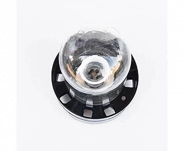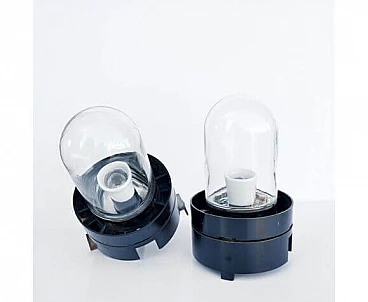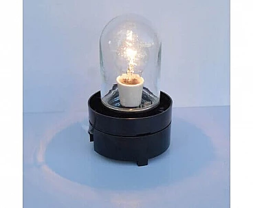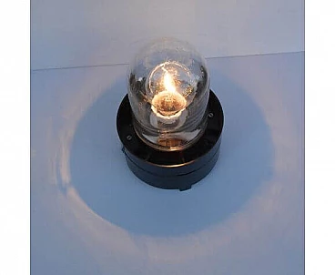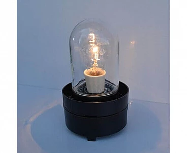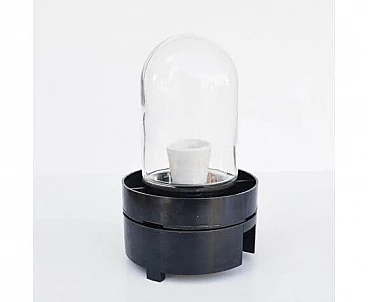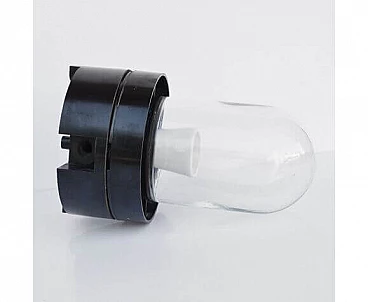Ceiling or wall lamp type 51130 produced in Czechoslovakia in the 1960s for Elektrosvit Nové Zámky. Lamp with spherical glass shade and plastic base - bakelite. The object is in modernist style with industrial elements. The lamp works with e27 bulbs up to 60w, some lamps also have hooks for hanging from the ceiling. The condition of the lamps is good, the plastic elements show signs of time: chips, scratches. Six lamps of this type are available. Height 23 cm; diameter 10 cm; base diameter 14 cm.