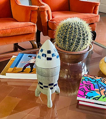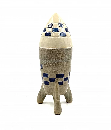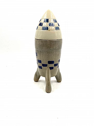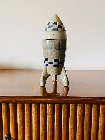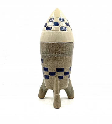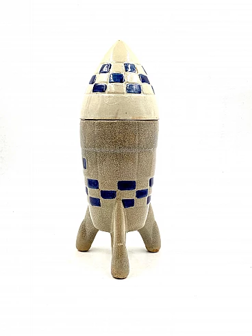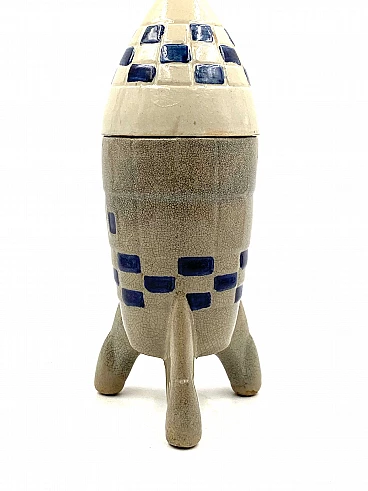 Gray and blue rocket-shaped ceramic bottle, 1940s-1950s.
