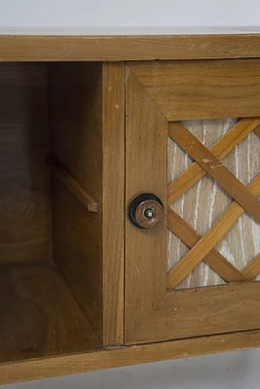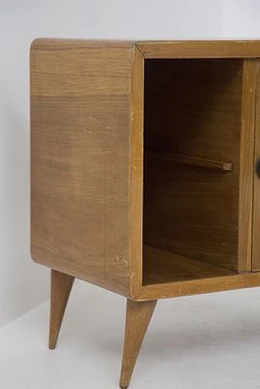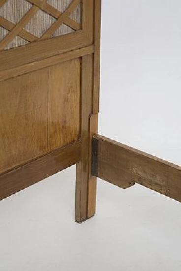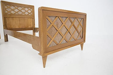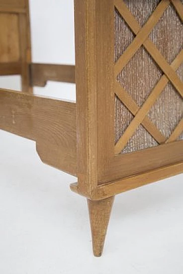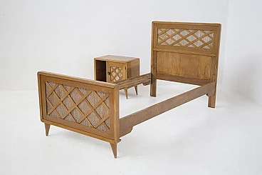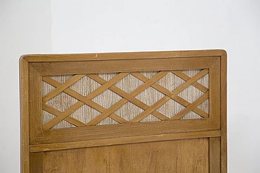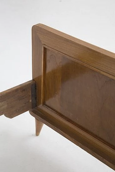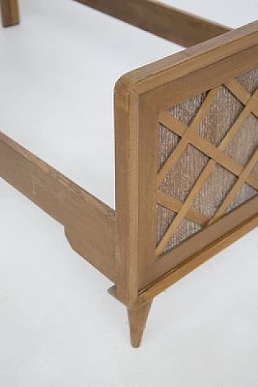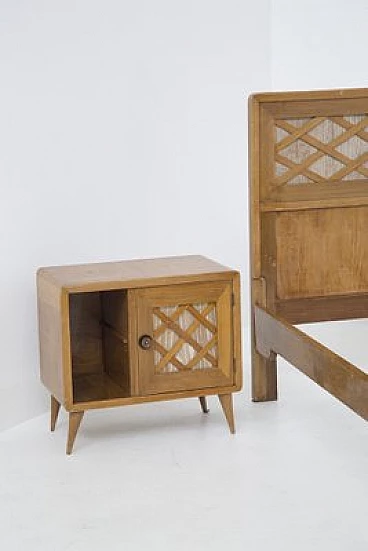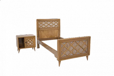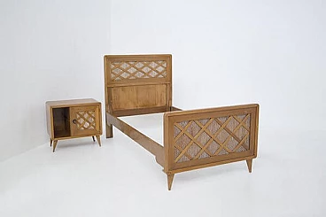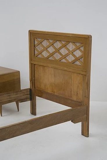 This wooden single bed and bedside table are designed by Paolo Buffa in the 1950s and they are of fine Italian workmanship. The bed has a classic rectangular shape, totally made of wood. There are 4 feet, but the feet under the headboard are rectangular, while the feet under the footboard are spike-shaped.The headboard and footboard are both made of wood and are similarly adorned with a wood panel, with weaves of the wood going to create a diamond pattern, very fine. The bed is accompanied by its bedside table. The nightstand is also made of wood, with hard, geometric shapes. There are 4 feet for support and they are all spike-shaped. It consists of a door, also decorated with diamond pattern and a brass handle in round patina, and an open space on the left. The bedroom set is ideal for rooms with vintage taste.