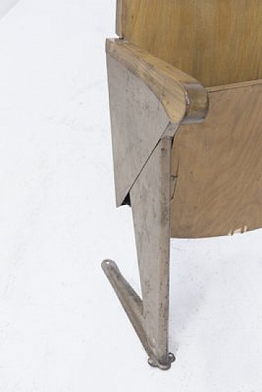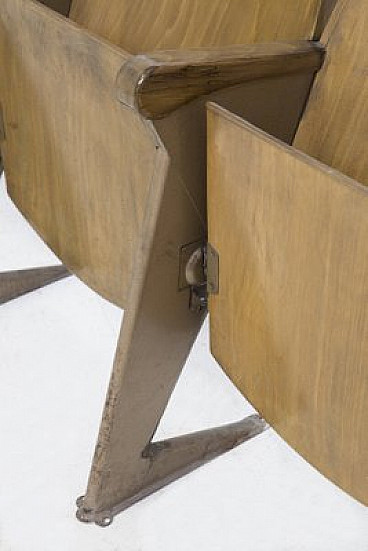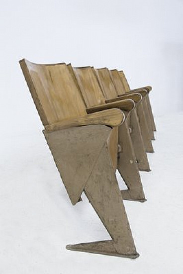Rare sedie da cinema realizzate da Gastone Rinaldi per il teatro IL Piccolo Milano nel 1952. Il modello in questione è LV 4. Le cinque poltrone da cinema o da teatro sono uno dei primi esempi realizzati per il Teatro IL PICCOLO di Milano. Sono realizzate in legno per la seduta e lo schienale, mentre la struttura delle gambe è in lamiera. Rinaldi attraverso l'inclinazione della seduta ricrea l'equilibrio perfetto per rimanere comodi anche al cinema. Nei piedi della sedia, nella parte in lamiera, sono visibili i fori che servivano per ancorare la seduta al pavimento con dei bulloni. In seguito Zanuso ha ripreso la stessa sedia e ne ha creato una nuova con un'evoluzione, realizzando il modello LV 5 in alluminio e Plastorima e zoccolo in lamiera. Le sedie sono ideali per soggiorni contemporanei in stile vintage o per uffici e studi di designer e architetti. Le sedie sono in ottime condizioni, presentano solo lievi graffi ma sono ancora molto belle.