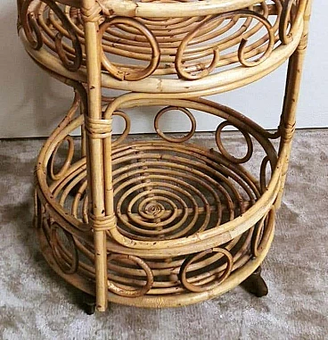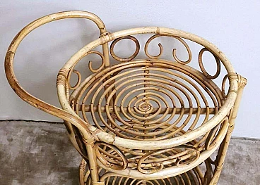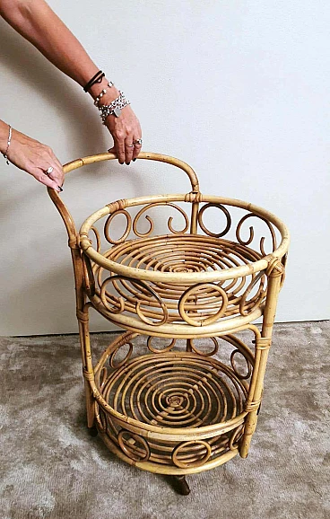 A peculiar handcrafted cart made of bamboo and rattan, it is characterised by a light and airy shape. The very solid structure is made of sturdy bamboo elements that give shape to two comfortable round containers joined by a complex frame, part of which has been bent and protrudes from the structure to form the convenient handle to push the cart, which, equipped with pivoting wheels, moves with great ease. It may be suggested to place two sheets of glass at the bottom of the round containers to further increase the functionality of the trolley. It was made, in the modernist style of Franco Albini, between 1967 and 1969 with extraordinary craftsmanship in a small workshop between the provinces of Parma and Cremona (Italy), along the banks of the river Po, an area of Italy that is very prolific and famous for the cultivation and production of bamboo. The tradition of this furniture originated in the United States in the late 19th century. The fashion soon spread to Europe and Italy, both in the Brianza area and in the Po Valley and Tuscany. From being an eminently poor material, it found itself playing the role of a luxury detail in contemporary designs, bringing with it the added value of dozens of hours of manual workmanship carried out by a dying class of specialised craftsmen. The term bamboo identifies a group of very vigorous evergreen herbaceous plants that grow in a tropical or very humid climate; all bamboo species share the common characteristic of a very tall hollow stem that is easy to work and rather rigid. It is used for the production of furniture, chairs, deckchairs, sofas but also objects and even parquet and flooring. Bamboo is a symbol of endurance: it is prized for its ability to withstand storms without breaking, thanks to its flexible, hollow stem and extraordinarily strong roots. It is a symbol of purity, steadfastness and other virtues. Rattan is obtained from Indian cane, nicknamed Indian Rattan or rattan cane, which when left to dry in the sun at the edge of forests takes on extraordinary qualities of strength and durability; in the field of outdoor furniture it is processed with or without bark. It is widely used for making chairs, tables, sofas and benches. Many people wonder what the difference between rattan and wicker is; wicker is the innermost part of the rattan cane that is split into very thin strips, so it is the most valuable and refined part of the Indian cane and for this reason is also more delicate. There is also wicker, a material obtained by weaving branches of willow or other plants. The elasticity and strength of willow wicker make it ideal for the production of baskets and baskets; reed, a small perennial plant found in marshy or maritime areas, is also used for these manufactures. Franco Albini (17 October 1905 - 1 November 1977) was an Italian architect, designer and university professor of neo-rationalist design. A young student of Gio Ponti, Albini became one of the key figures of Italian Rationalism in the early 1930s, of which he gave an eclectic interpretation in many respects. It was on the basis of these convictions that he approached the world of textile fibres after the war, forging a close relationship with Vittorio Bonacina's workshop. The result of this collaboration culminated in the bamboo and Indian cane furniture presented at the 9th Triennale in 1951. The material, traditional and poor, was tackled for the first time with a spirit of research and avant-garde, resulting in some masterpieces that have left an indelible mark on the history of design. The bar trolley is in good condition. Width 45 cm, depth 32 cm, height 60 cm. For all shipments we use special packaging materials (wooden crates, polystyrene, etc.) for maximum protection and safety of the objects.